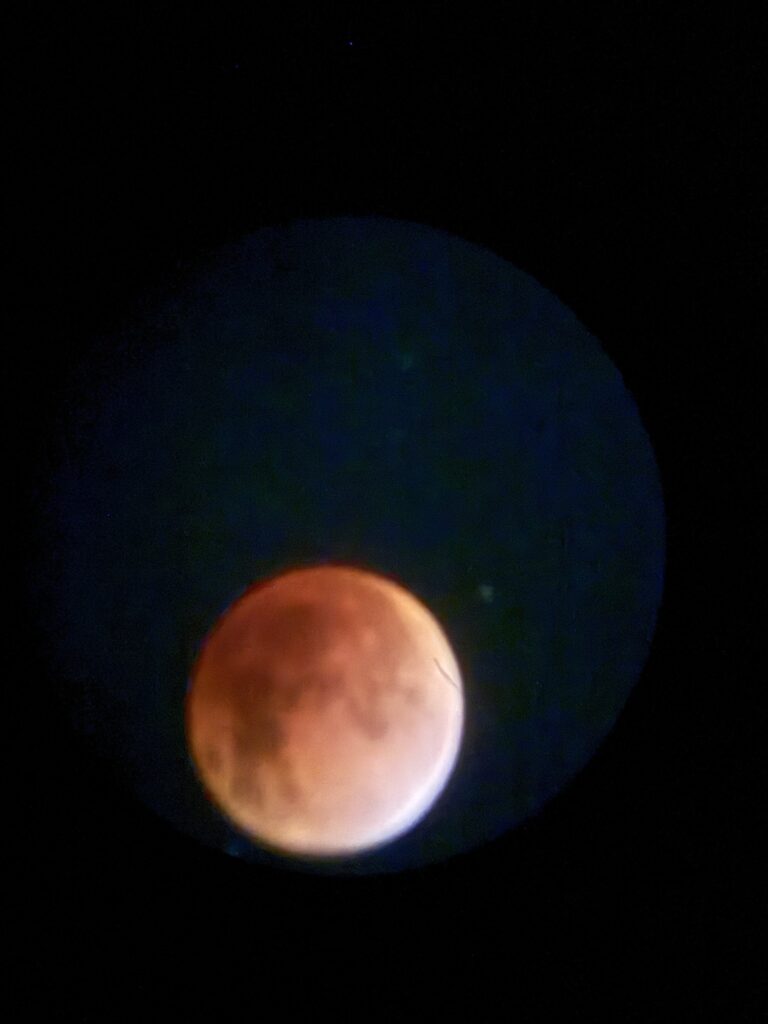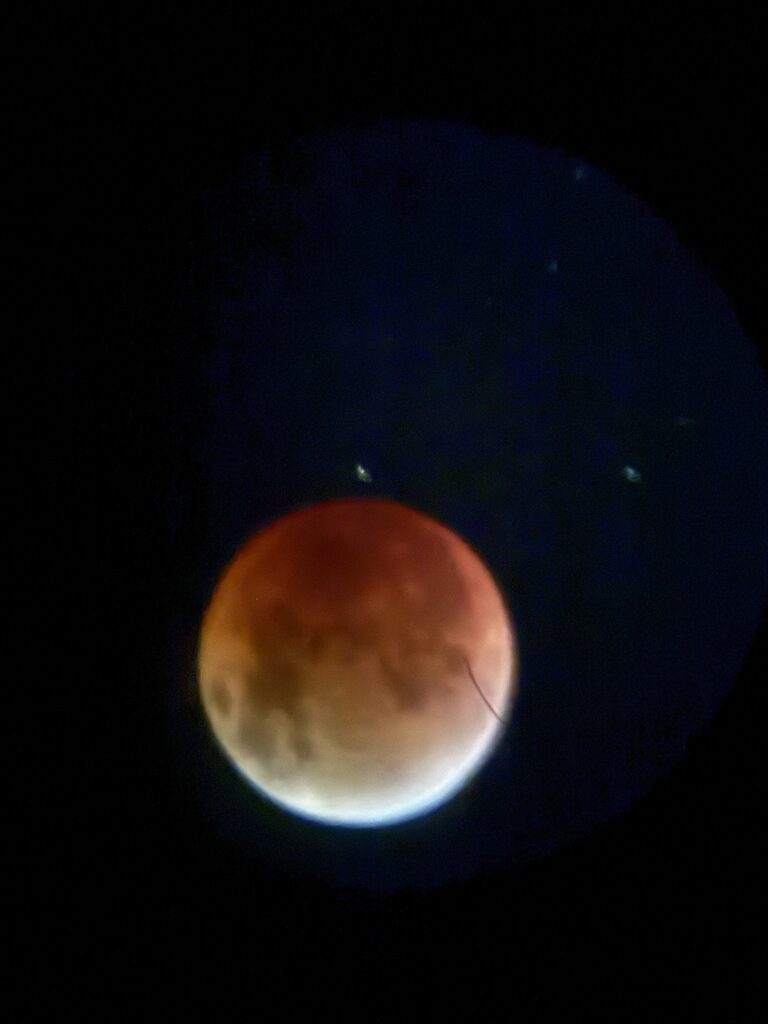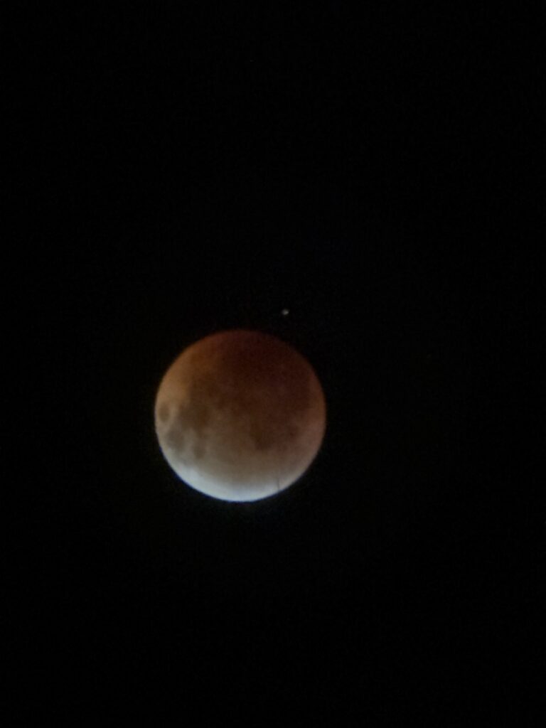 皆既月食のピーク。月が赤く染まり、とても神秘的でした。写真ではうっすらですが、肉眼ではもっと鮮やかに赤が広がっていました。