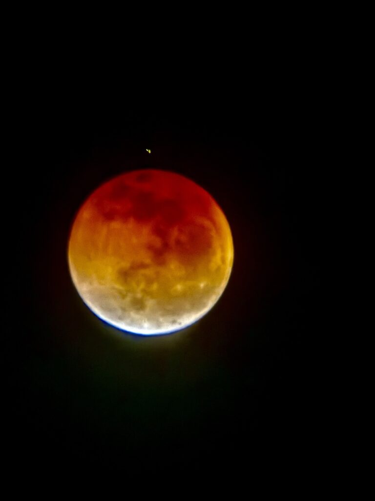 この夜は月のそばに土星も輝いていました。写真に収めると、月食と惑星の共演という特別な一瞬を感じられて、ちょっと得した気分になりました。