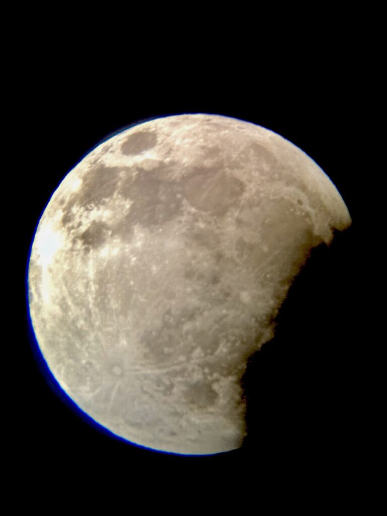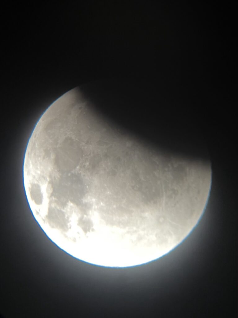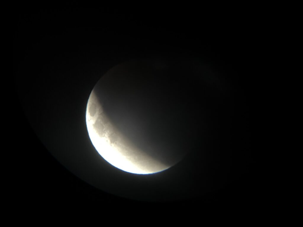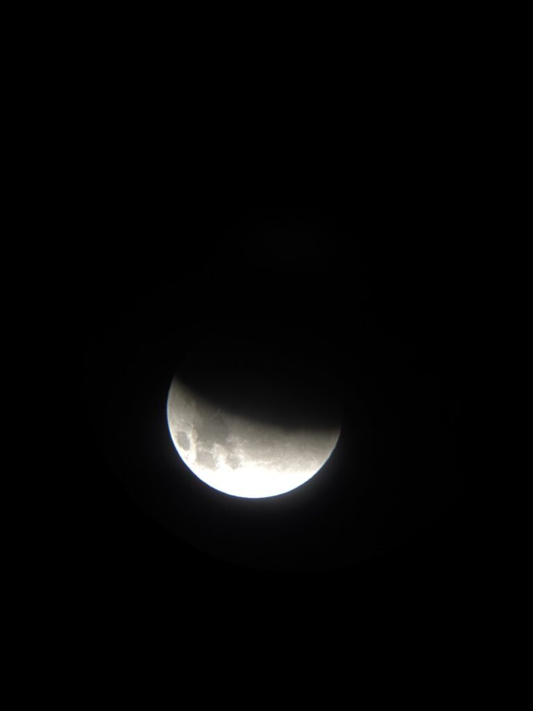 左下から影がかかり始めました。いよいよ月食が進行。最初の変化を捉えられた瞬間です。