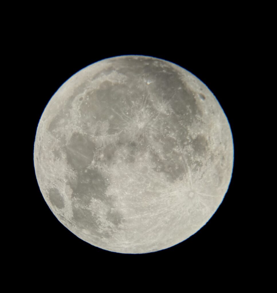 満月に近い姿。まだ月食は始まっておらず、白く明るく輝いています。空気も澄んでいて、とてもクリアに見えました。