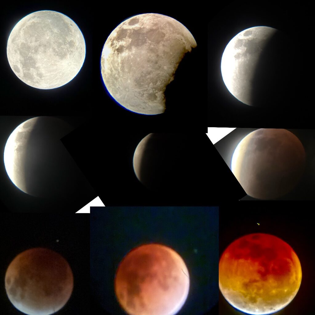 深夜から明け方にかけてじっくり空を見上げると、月が少しずつ欠けていき、やがて赤く染まっていく——そんな神秘的な光景に出会えました。私は今回、思い切ってカメラを持ち出し、記録として合計13枚撮影しました。